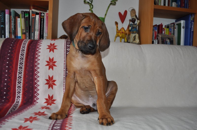 Ich wiege 4020 Gramm und werde meinem großen Bruder (ehemals auch mit grünem Halsband) aus dem B-Wurf immer ähnlicher.